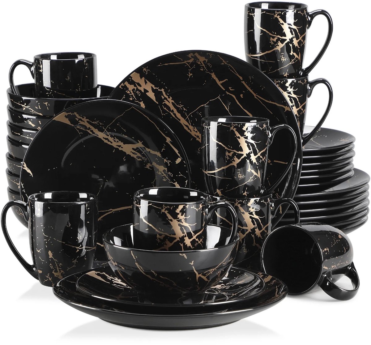 TELEO Serviesset 32-delig – Zwart Porselein met Gold Splash Design – Dinerborden, Taartborden, Kommen & Koffiekopjes – Luxe Serviesset voor 8 personen